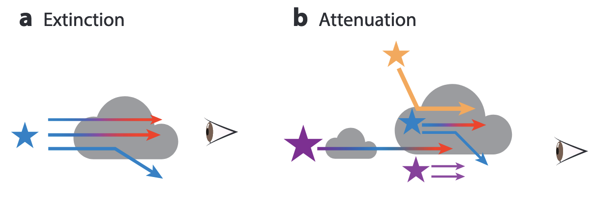 Dust extinction occurs when light from an object gets scattered or absorbed by dust. This is different from dust attenuation, which refers to the combined effect of extinction and the relative geometry of stars and dust along the line of sight (see figure). In both cases, light gets scattered and absorbed as it interacts with dust particles.